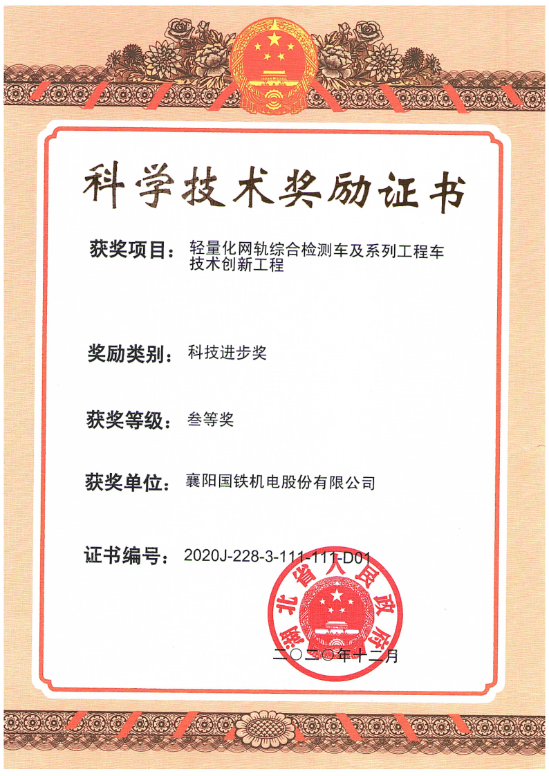 湖北省科技進(jìn)步三等獎(jiǎng) 輕量化網(wǎng)軌綜合檢測車及系列工程車技術(shù)創(chuàng)新工程