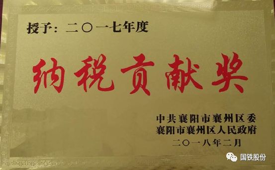 近日,襄陽國鐵被授予“襄州區(qū)2017年度納稅貢獻(xiàn)獎(jiǎng)”,并獲得現(xiàn)金獎(jiǎng)勵(lì)6萬元。