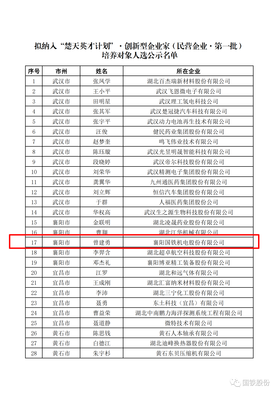 喜報(bào)!國(guó)鐵機(jī)電董事長(zhǎng)曾建勇入選“楚天英才計(jì)劃”·創(chuàng)新型企業(yè)家培養(yǎng)對(duì)象
