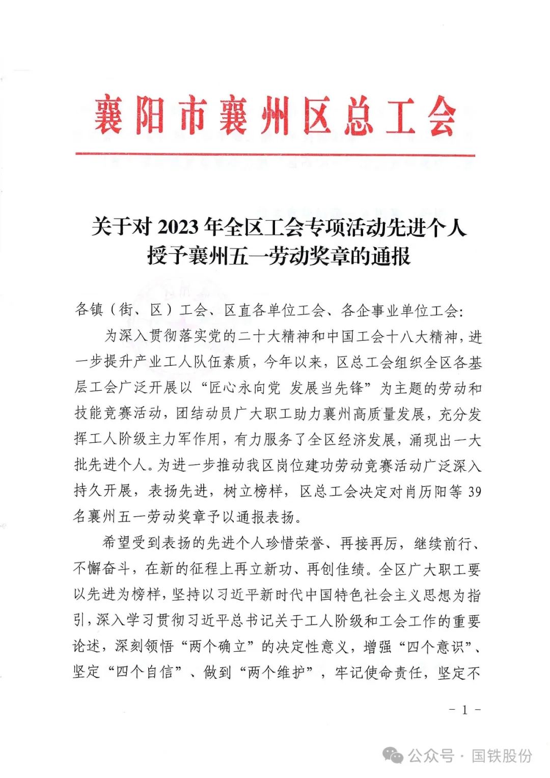 【喜報】恭賀楊定全同志獲“襄州五一勞動獎?wù)隆睒s譽